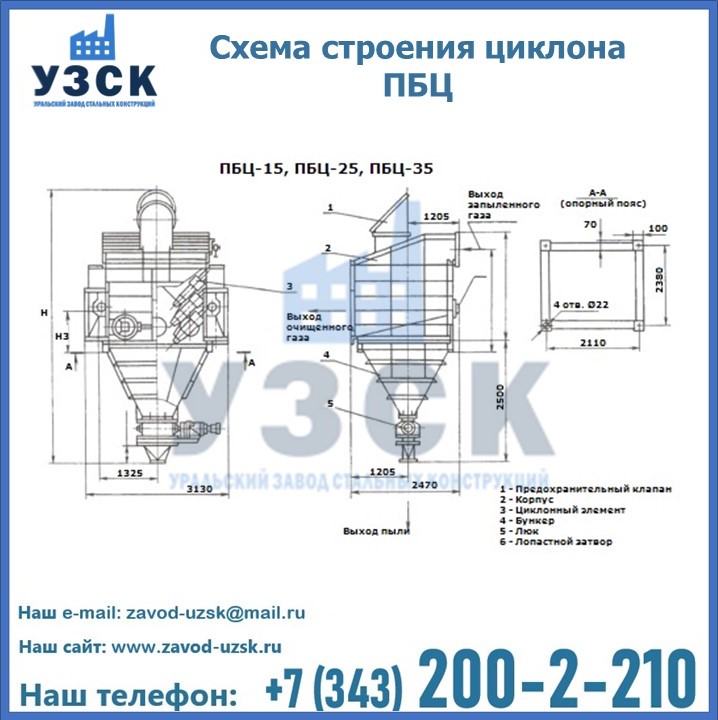 Завод «УЗСК» в Байконуре предлагает приобрести циклоны ПБЦ и прочие устройства, полностью укомплектованные и готовые к эксплуатации. Мы гарантируем соответствие оборудования всем требованиям ГОСТ и ТУ, износостойкость и высокую производительность предлагаемого оборудования. Уральский Завод Стальных Конструкций изготавливает и продает надежное, эффективное и производительное оборудование, имеющее длительную гарантию и большой эксплуатационный ресурс. Если требуется изготовить циклон нестандартных размеров, то такой вариант выполнения заказа тоже предусмотрен, так как предприятие имеет собственные производственные площади и надежных поставщиков. На все поставляемое или производимое оборудование имеются чертежи и прочая техническая документация. Заказать и купить циклоны или прочее оборудование высокого качества и по доступной цене можно через наш сайт или по указанному в разделе «Контакты» телефону.