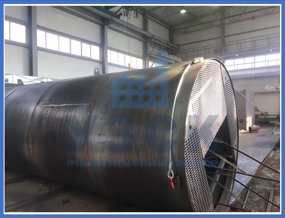 На заводе готовятся листы стали с максимальным размером 2 500х10 000 мм. Их завальцовывают на нужный радиус, чистят срезы и упаковывают. Также готовят сборные детали днища. Стыковка всех элементов ведется на площадке, методом сварки. Рабочий чертеж указывает последовательность соединения промаркированных заготовок. Швы подвергаются неразрушающему контролю.